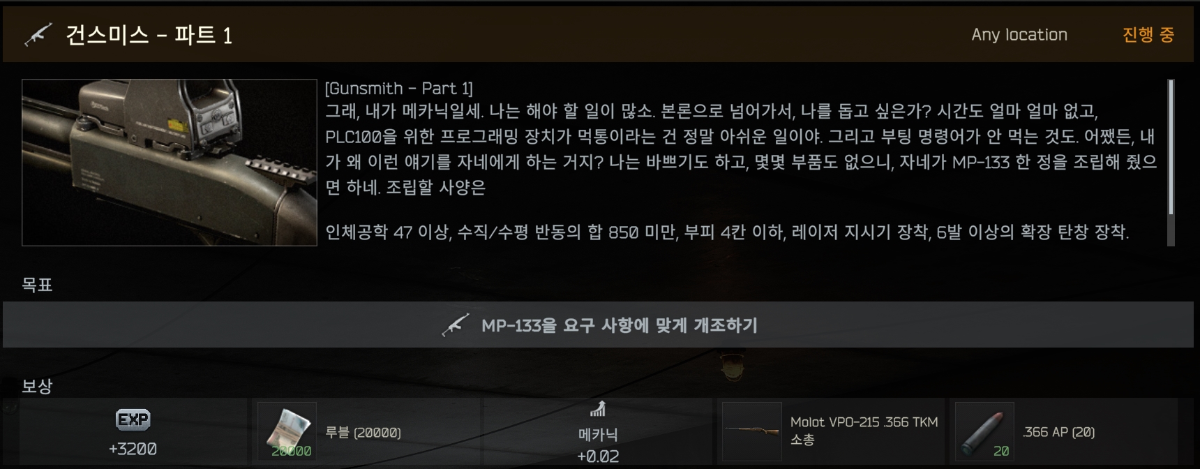 건스미스 퀘스트들은 보통 플리마켓에서 구해서 제작하면 빠르게 뚫리니 플리마켓이 열린 후에 천천히 열어도 무관하다.
